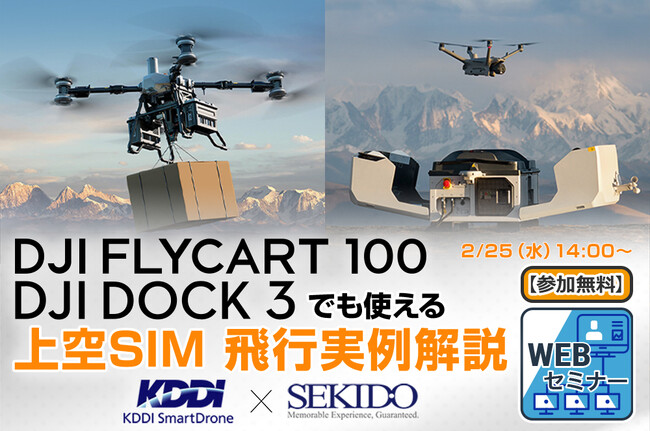 DJI(ディージェイアイ)正規販売代理店としてドローンビジネスの最前線を支える株式会社セキド(本社:東京都港区、代表取締役:大下貴之)は、2026年2月25日(水)14時00分より無料WEBセミナー「DJI FLYCART 100/DJI DOCK 3でも使える 上空SIM 飛行実例解説WEBセミナー」を開催します。