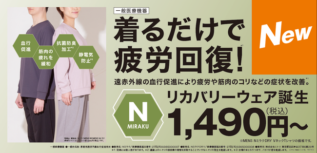 リカバリーウェア「Nミラクシリーズ」は、一般医療機器「家庭用遠赤外線結構促進用衣」届出済衣料です。原材料繊維に高純度セラミックスを定着する加工を施すことによって、遠赤外線の血行促進作用による疲労回復や筋肉のコリを軽減する効果が期待できます。また、抗菌防臭加工(※2)や静電気防止加工(※3)もついており、より快適な着心地でお使い頂けます。