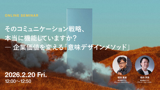 コミュニケーション変革をクリエイティブで実現する株式会社アマナ(本社:東京都品川区、代表取締役社長:金子剛章、以下「アマナ」)は、2026年2月20日(金)、『そのコミュニケーション戦略、本当に機能していますか? ― 企業価値を変える「意味デザインメソッド」』をテーマにウェビナーを開催します。