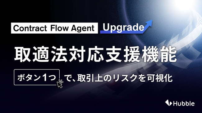 契約業務・管理クラウドサービス「Hubble(ハブル)」を提供する株式会社Hubble(本社:東京都渋谷区、CEO:早川 晋平、CTO:藤井 克也、CLO:酒井 智也)は、契約業務フローの進行や意思決定を支援する契約AIエージェント「Contract Flow Agent(コントラクト・フロー・エージェント、以下CFA)」において、2026年1月1日に施行された製造委託等に係る中小受託事業者に対する代金の支払の遅延等の防止に関する法律(中小受託取引適正化法、以下「取適法」)への対応を支援する新機能「取適法対応支援機能」を実装したことをお知らせします。本機能は、「Hubble」および、締結済契約書を入れるだけでAIが契約データベースを構築するクラウドサービス「Hubble mini」におけるオプション機能として利用することができ、契約の審査から締結後の管理に至るまで、適法な実務運用を全面的にサポートします。