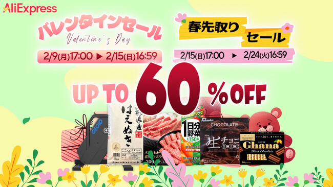 グローバルECプラットフォームである「AliExpress(アリエクスプレス)」は、2026年2月9日(月)17:00~2月24日(火)16:59の間に、最大60%オフの「バレンタインセール」、人気トレンド商品を豊富に展開する「春先取りセール」の2つのセールを連続開催します。それぞれのセールを通じて、「もっとお得に、もっと選べる」お買い物の機会を提供します。また、本サイトでは食品カテゴリーのラインナップを継続的に拡充しています。国産米や和牛、持ち運びが難しい飲料水など、日常的に必要な商品をよりお手頃な価格で購入することができます。