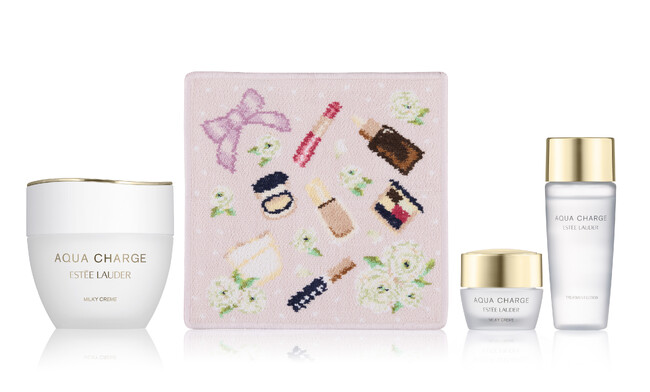 アクア チャージ セット ¥12,100 (税込)日本で研究・開発・生産した医薬部外品のスキンケア シリーズ「アクア チャージ」の人気製品アクア チャージ 薬用 ミルキー クリーム50mL現品をメインに、旅行や出張に便利なスペシャルサイズの同クリーム、同シリーズのトリートメント ローション、そして柔らかなパープルのエスティ ローダー×フェイラー オリジナル ハンカチ1枚をセットしました。