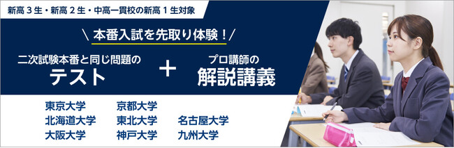 学校法人河合塾は、2026年3月、新高3生・新高2生・中高一貫校の新高1生を対象に、「難関国立大学入試本番チャレンジ」を開催します。2月25・26日に実施されたばかりの東大・京大をはじめとする難関国立大学の二次試験問題にいち早くチャレンジし、志望校の入試本番を体験することができます。さらにプロ講師による解説講義と答案採点を通じて、今後の学習に大いに役立てていただけます。