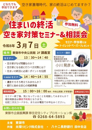 長野県東御市では、年々増加する空き家問題への対応として、空き家の発生を未然に防ぐことを目的とした「住まいの終活 空き家対策セミナー&相談会」を開催します。