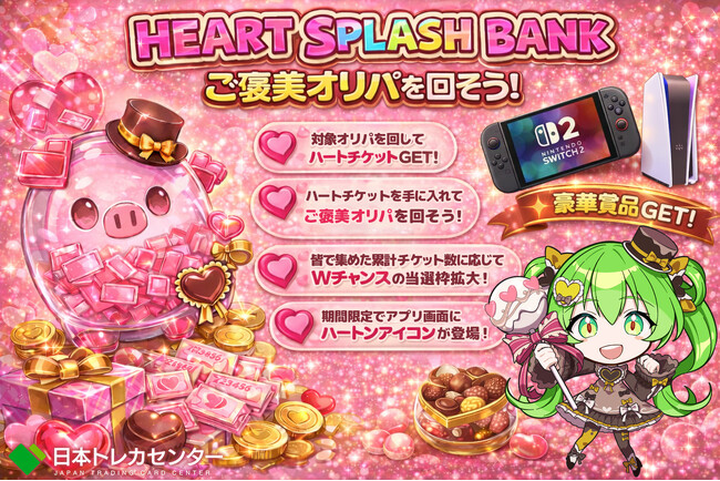株式会社日本トレカセンター(本社:東京都、代表取締役CEO:大山 敏浩)は、バレンタインシーズンに合わせ、ユーザー参加型の期間限定イベント「HEART SPLASH BANK(ハートスプラッシュバンク)」を、2026年2月9日(月)15:00より開催することをお知らせいたします 。