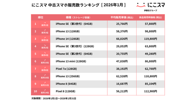中古スマートフォンの個人向け販売・買取サービス「にこスマ」を運営する株式会社Belong(本社:東京都港区、代表取締役社長:西村 耕一郎 以下、「Belong」)は、「にこスマ」における2026年1月の中古スマホ/機種別販売数・買取数ランキングを発表します。