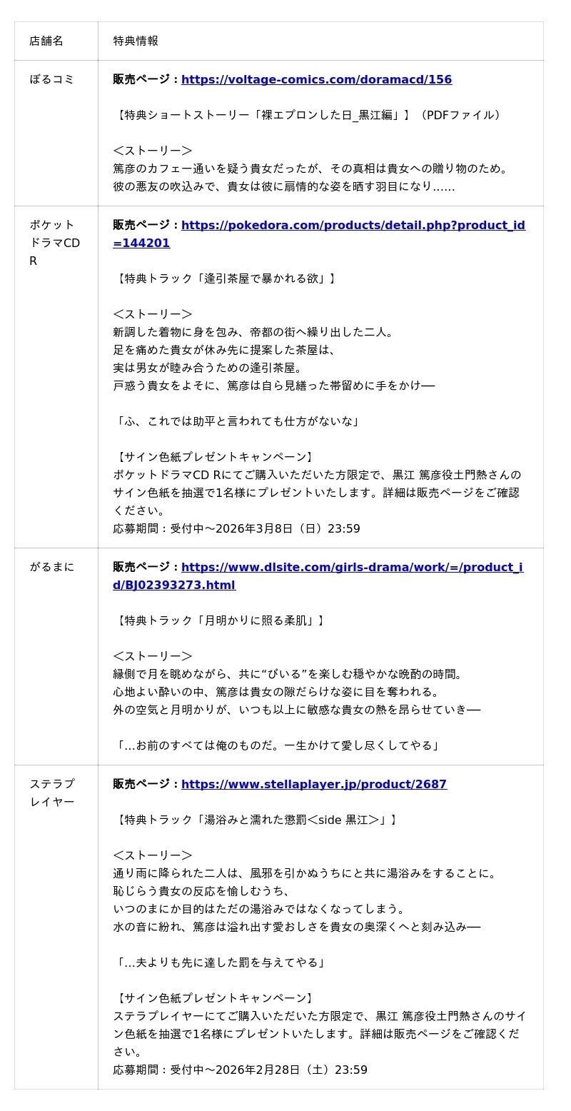 本作の発売を記念し、 「ぼるコミ」では、期間限定で25%オフとなるキャンペーンを実施しているほか、 「DLsiteがるまに」「ポケットドラマCD R」「ステラプレイヤー」では事前予約いただくと本作が10%オフとなるキャンペーンも実施しております。店舗ごとに購入特典もご用意しておりますので、ぜひご注目ください。