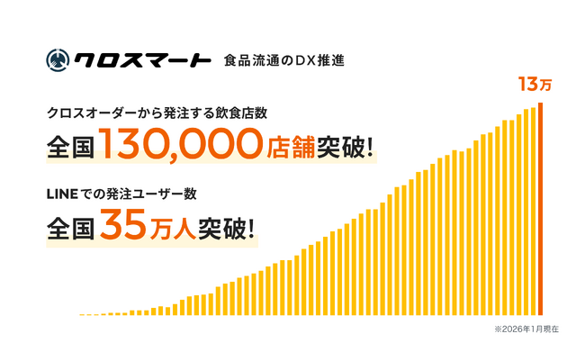 食品流通のDX(デジタルトランスフォーメーション)を推進するクロスマート株式会社(本社:東京都千代田区、代表取締役:寺田 佳史、以下「当社」)は、提供する外食業界向け受発注プラットフォーム「クロスオーダー」において、発注ユーザー数が35万人、月間アクティブ利用店舗数が13万店を突破したことをお知らせします。