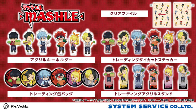 システムサービス株式会社(本社:東京都豊島区、代表取締役社長:田村宗弘)は、アニメ・マンガ・ゲーム作品等のキャラクター商品の企画・製作・販売をする自社ECサイト「FaNeMa」(URL:https://fanema.jp/)にて、アニメ『マッシュル-MASHLE-』より「トレーディングアクリルスタンド」「缶バッジ」「ダイカットステッカー」他 全5種類の新商品を発売いたします。