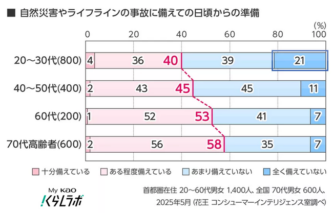 東日本大震災から今年で15年。地震や台風などに加え、水道・下水道など社会インフラの老朽化も進む日本。地震をはじめとする自然災害だけではなく、ライフラインの停止のリスクもあります。地震だけではない、様々な災害リスクに対して、備えはできているでしょうか。花王株式会社では、「災害への備えに関する意識と実態」調査を3つの属性で実施し、その調査結果を2026年2月10日に、「My Kao くらしラボ(※1)」にて公開します。