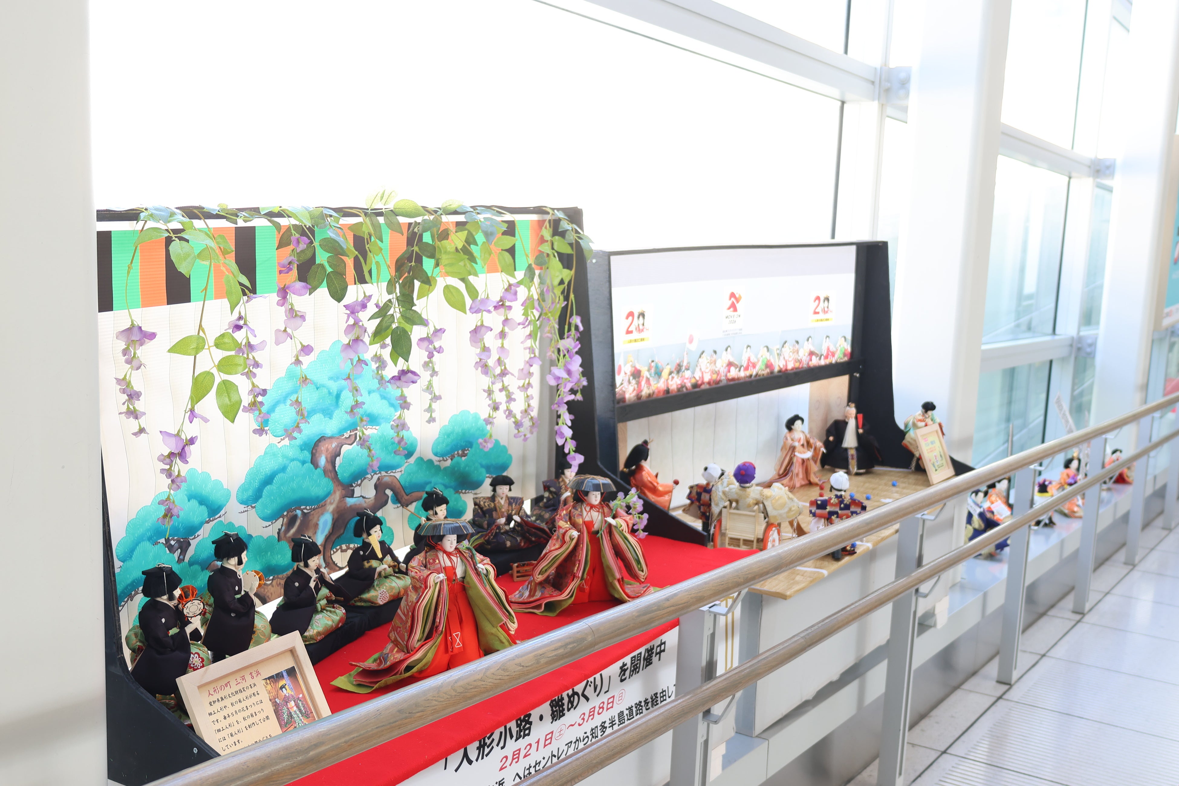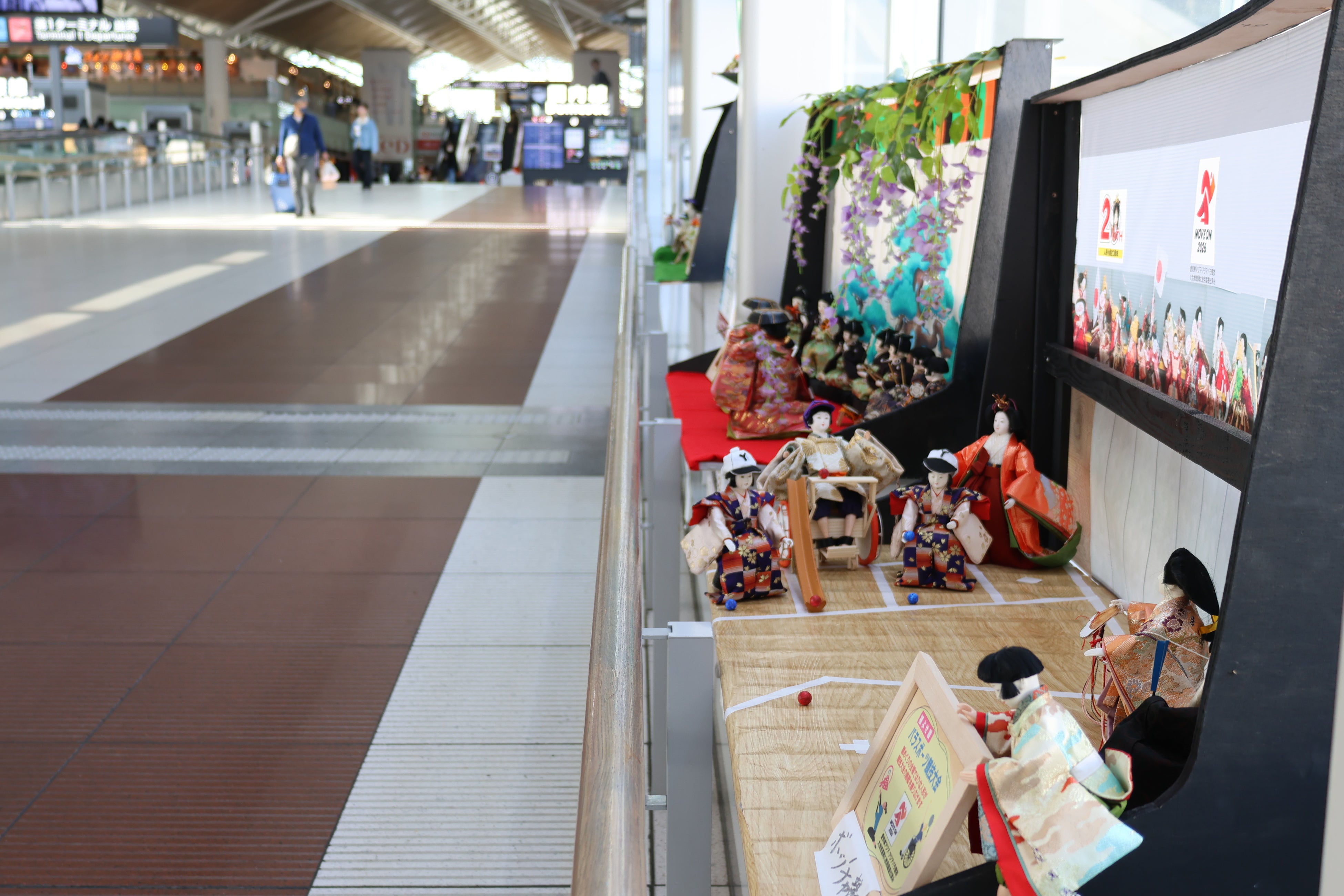 アクセスプラザ~第1ターミナル3階連絡通路両側に4つの地域の雛人形が並んでいます!