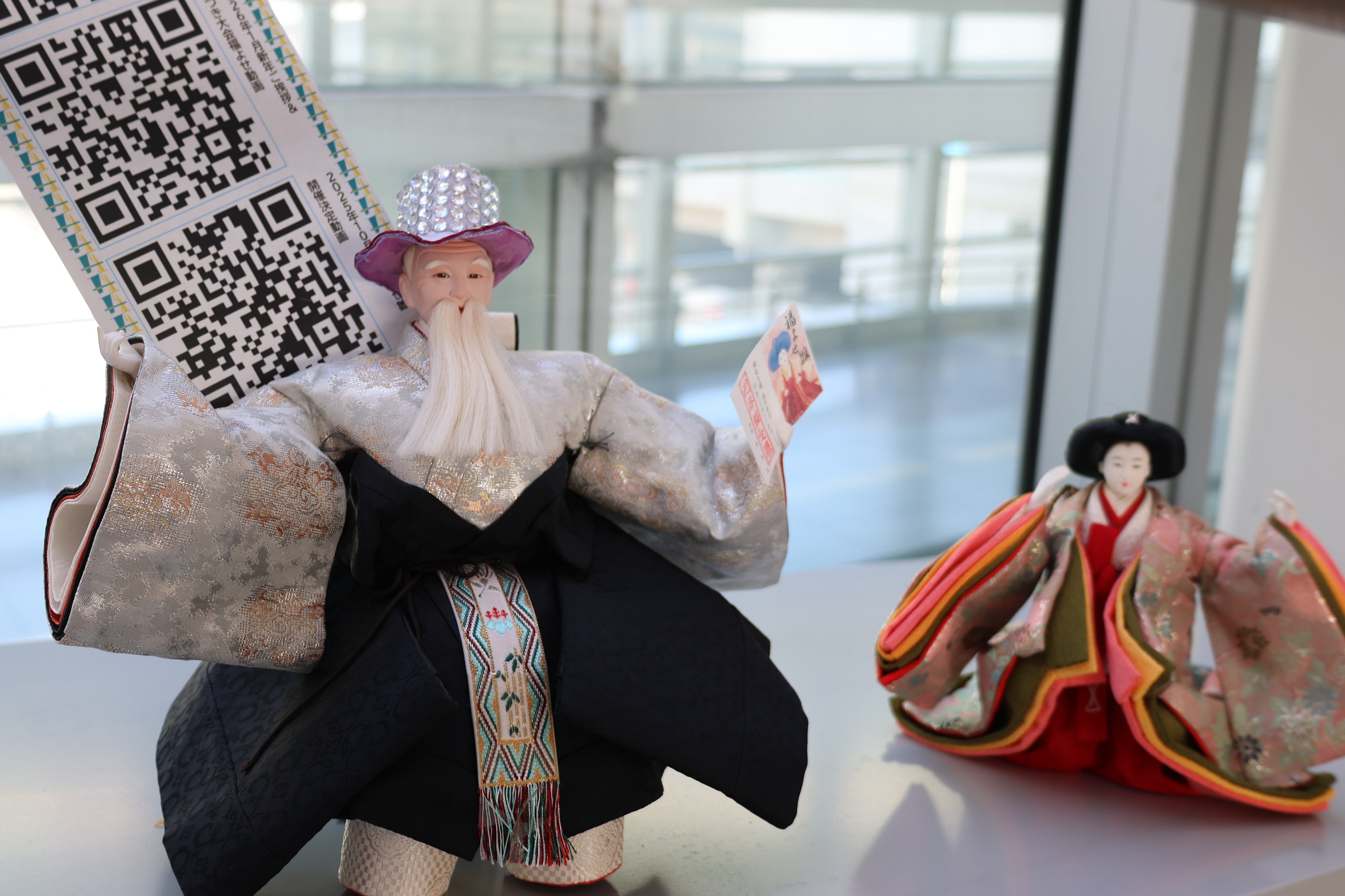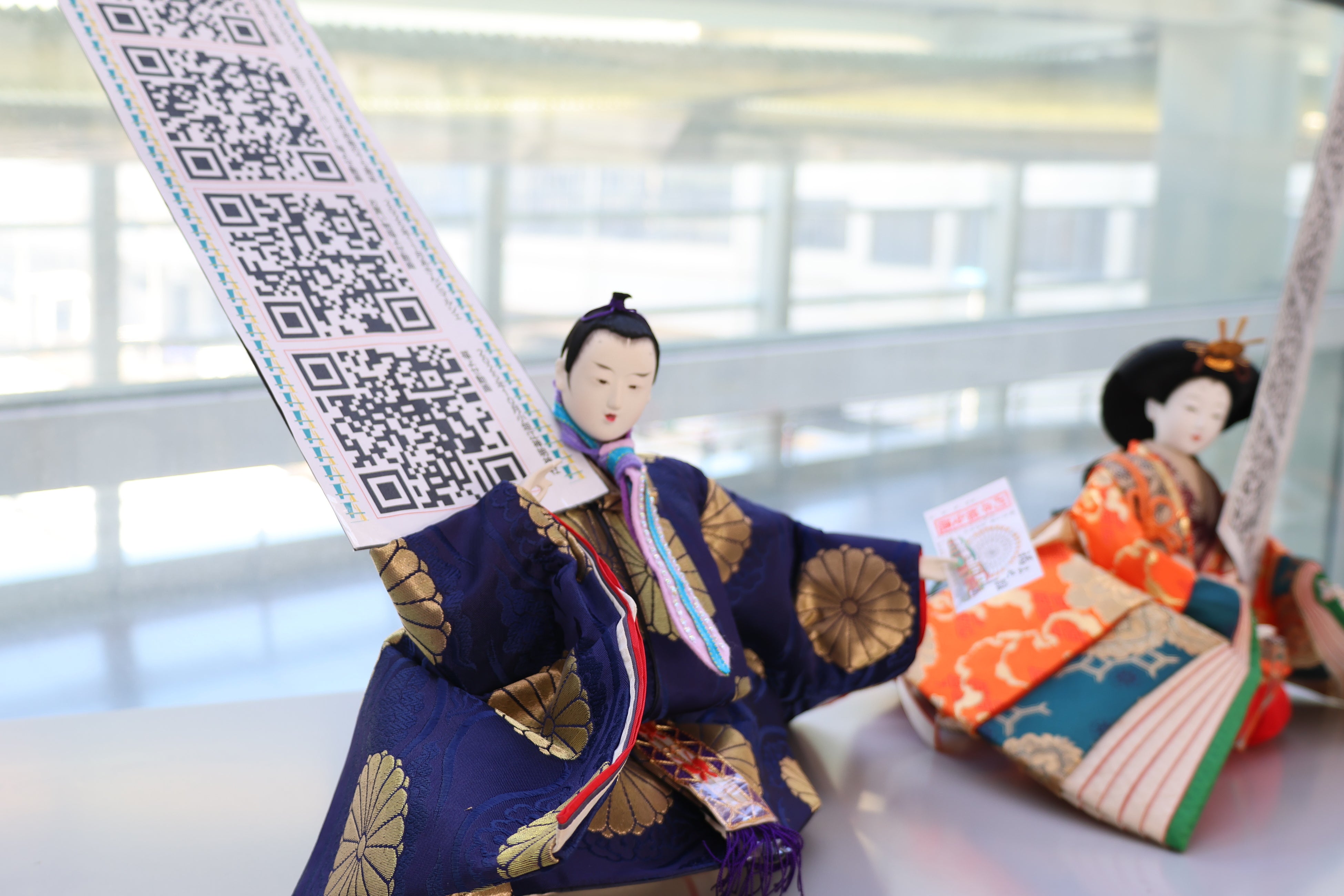 二次元コードを手にした雛人形の近くに、実際に読み取れる空港案内用の二次元コードを設置。