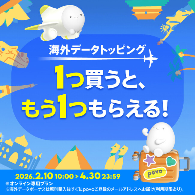 KDDI、沖縄セルラーは2026年2月10日から4月30日まで、povo2.0において、海外データトッピングを買うと、同じ海外データトッピングがもう1つもらえる「海外ローミングキャンペーン」を実施します。1回分の料金で2回分のデータを使用できるため、春休みやゴールデンウィークの海外旅行などでおトクに利用できます。