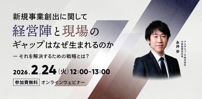 アスタミューゼ株式会社(本社:東京都千代田区、代表取締役社長 永井歩)は、2026年2月24日(火)12:00-13:00に、無料ウェビナー「新規事業創出に関して経営陣と現場のギャップはなぜ生まれるのか」を開催いたします。新規事業における「大企業のジレンマ」の解決策について具体的な事例をベースに解説いたします。