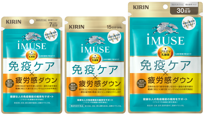 キリンホールディングス株式会社(社長 COO 南方健志、以下キリン)は、キリンの独自素材「プラズマ乳酸菌」と一過性の疲労感を軽減する「還元型コエンザイムQ10」を配合した「キリン iMUSE(イミューズ) 免疫ケア・疲労感ダウン 15日分」を2月20日(金)に外部通販、3月17日(火)に自社通販で新発売します。また、同商品の7日分、30日分を4月21日(火)に全国のドラッグストアにて発売します。