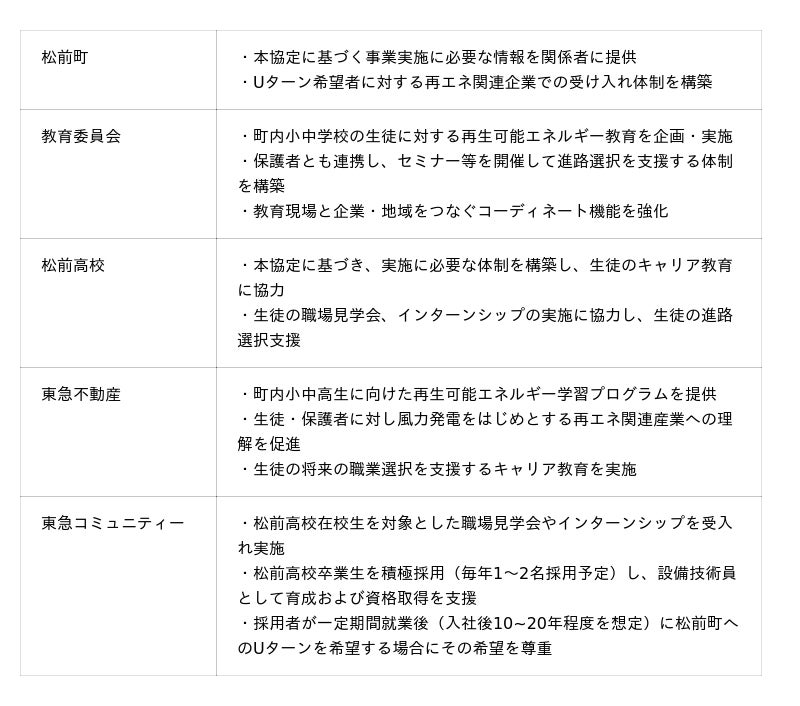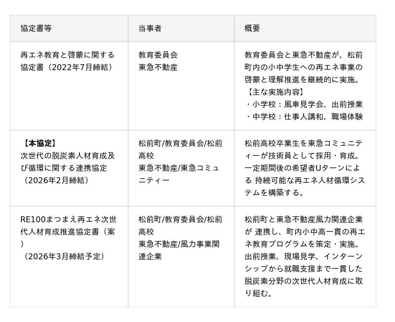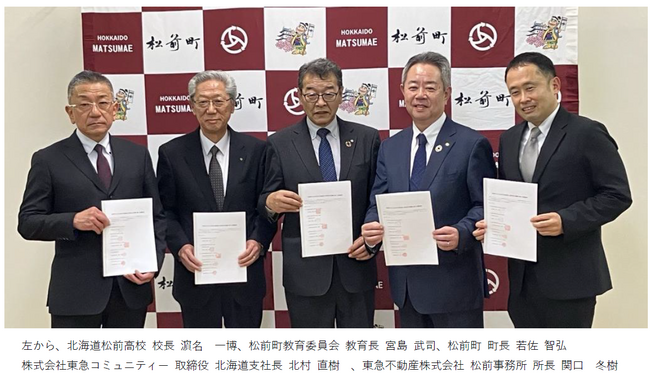 松前町(所在:北海道松前郡松前町、町長:若佐 智弘、以下「松前町」)、松前町教育委員会(所在:北海道松前郡松前町、教育長:宮島 武司、以下「教育委員会」)、北海道松前高等学校(所在:北海道松前郡松前町、校長:濱名 一博、以下「松前高校」)、東急不動産株式会社(本社:東京都渋谷区、代表取締役社長:星野 浩明、以下「東急不動産」)、株式会社東急コミュニティー(本社:東京都世田谷区、代表取締役社長:木村 昌平、以下「東急コミュニティー」)の五者は、「松前町における次世代の脱炭素人材育成及び循環に関する連携協定」(以下「本協定」)を2026年2月4日に締結しましたのでお知らせいたします。