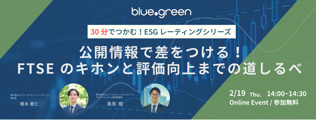 株式会社エスプールブルードットグリーン(本社:東京都千代田区、取締役社長:八林公平)は、2026年2月19日(木)14:00より、無料オンラインセミナー「~30分でつかむ!ESGレーティングシリーズ~公開情報で差をつける!FTSEのキホンと評価向上までの道しるべ」を開催いたします。