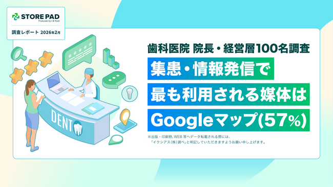 AI搭載型の情報発信・分析プラットフォーム「STOREPAD(ストアパッド)」を提供するイクシアス株式会社(本社:東京都中央区、代表取締役社長 CEO:内藤 崇司)は、歯科事業者向けに【歯科医院 院長・経営層100名調査】集患・情報発信で最も利用される媒体はGoogleマップ(57%)」を公開します。