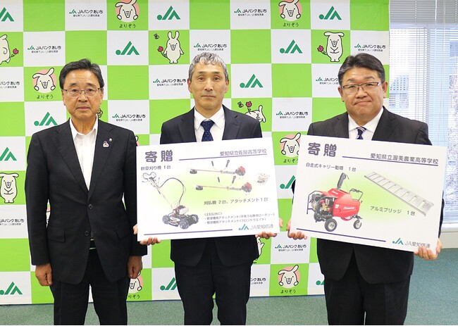 JA愛知信連(愛知県信用農業協同組合連合会 代表理事理事長:磯村幹夫)は、社会貢献活動の一環として、佐屋高等学校へ畔草刈り機・刈払機+アタッチメント・管理機用アタッチメント2種を、渥美農業高等学校へ自走式キャリー動噴・アルミブリッジを寄贈しました。