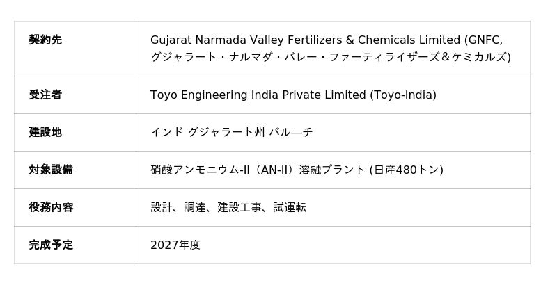 東洋エンジニアリング株式会社(代表取締役 取締役社長 CEO: 細井 栄治)のインド子会社であるToyo Engineering India Private Limited (社長: 川原 崇、以下Toyo-India)は、インドを代表する工業化学品の製造企業であるGujarat Narmada Valley Fertilizers & Chemicals Limited(GNFC)より、Bharuc(バル―チ)工場における日産480トン規模の硝酸アンモニウム-II(AN-II)溶融プラント建設プロジェクトを受注しました。2027年度の完工を予定しており、Toyo-Indiaは設計、調達、建設工事、試運転(EPC)を担当します。