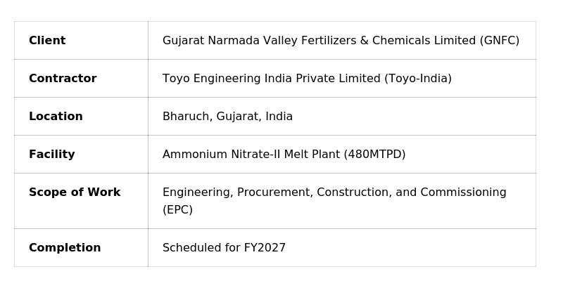 Toyo Engineering India Private Limited (Toyo-India, Managing Director: Takashi Kawahara), a subsidiary of Toyo Engineering Corporation (President and CEO: Eiji Hosoi), has been awarded a contract from Gujarat Narmada Valley Fertilizers & Chemicals Limited (GNFC), for new 480 MTPD Ammonium Nitrate-II (AN-II) Melt Plant at its Bharuch facility. Toyo-India will be responsible for the Engineering, Procurement, Construction and Commissioning (EPC) of the facility. The project is scheduled for completion by FY 2027.