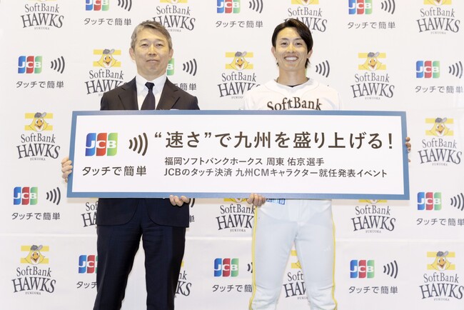 株式会社ジェーシービー (本社:東京都港区、代表取締役会長 兼 執行役員社長:二重 孝好、以下:JCB)は、福岡ソフトバンクホークス 周東佑京選手を九州エリアにおけるJCBのタッチ決済CMキャラクターに起用し、2026年3月上旬より九州エリア限定でTVとWEBの新CMを公開いたします。公開に先駆けて宮崎市生目の杜運動公園アイビースタジアムにて新CMキャラクター就任式を行いました。