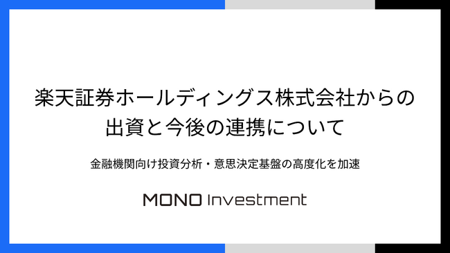 株式会社MONO Investment(本社:東京都品川区、代表取締役:佐々木 辰/中西 諒、以下「MONO Investment」)は、このたび、楽天証券ホールディングス株式会社(本社:東京都港区、代表取締役社長:楠 雄治、以下「楽天証券HD」)より、出資を受けたことをお知らせいたします。