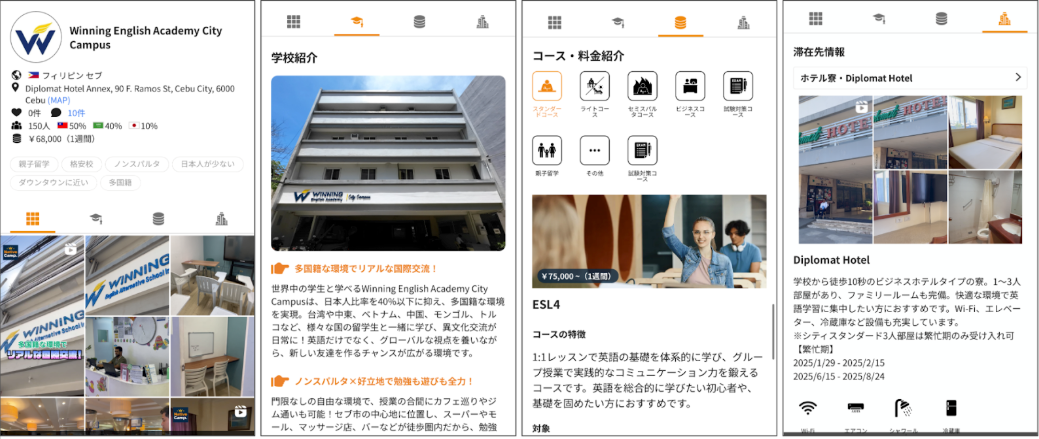 ネイティブキャンプ留学では、ユーザーが必要な情報を分かりやすく把握できるよう、常に丁寧で明確な情報提供を心がけています。Winning English Academyの詳細情報は、以下の4つのカテゴリーに分けて掲載しており、知りたい情報を的確にお届けします。