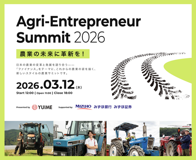 農業の未来に革新を!「Agri-Entrepreneur Summit 2026」が3月12日に開催【YUIME主催、みずほ銀行・みずほ証券特別協賛】