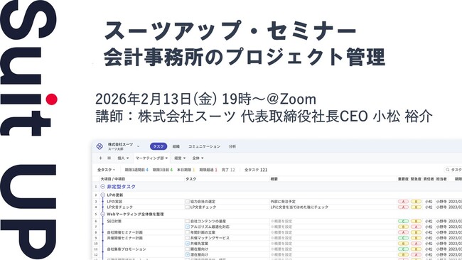 株式会社スーツ(所在地:東京都千代田区、代表取締役社長CEO:小松 裕介)は、2026年2月13日(金)19時から、当社代表の小松が講師を務めるスーツアップ・セミナー「会計事務所のプロジェクト管理」を無料開催します。