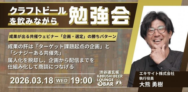 渋谷のマーケター&起業家コミュニティを運営するKOBUSHI MARKETING合同会社(東京都渋谷区、代表:井上裕介)は、2026年3月18日(水)19:00~ゲストにエキサイトの大熊執行役員を迎え、成果が出る共催ウェビナーの仕組みについて解説するマーケティング勉強会を開催すると発表した。