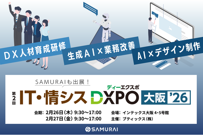 企業のDX支援およびIT教育を展開する株式会社SAMURAI(本社:東京都港区、代表取締役:羽田 吾立)は、2026年2月26日(木)・27日(金)にインテックス大阪で開催される展示会『IT・情シスDXPO大阪’26』に出展いたします。当日は、DX推進のコアになる人材を育成する実践的なプログラムや、業務改善・自動化の第一歩となるノーコード×生成AI研修を公開。人手不足やIT人材依存の課題を解決するための、新しい社内研修のかたちをご紹介します。