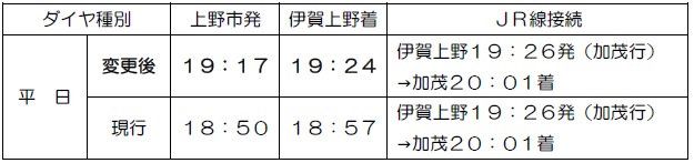 (2)平日ダイヤのJR線伊賀上野駅19時台の加茂行への接続を改善します。