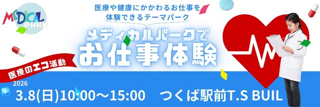 3月8日(日)10時~15時、つくば駅前T.S BUILにて「メディカルパークでお仕事体験」を開催します。子どもたちに医療や健康に関わるお仕事体験をしていただける楽しいイベントです!