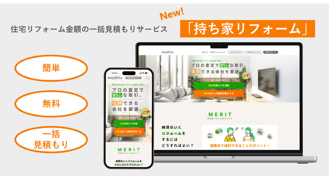 この度開始する「持ち家リフォーム」は、住宅のリフォームに興味がある方に対し、リフォームの第一歩となる見積もり依頼をサポートいたします。Web上でリフォーム箇所等を入力するだけで、独自審査を通過した複数の優良リフォーム会社から見積もり結果が届くサービスです。完全無料かつ簡単なプロセスでリフォーム時の時間と手間を大幅に削減します。