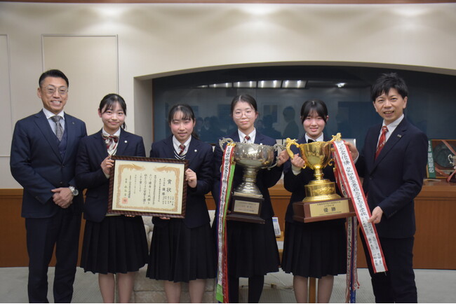 長坂市長を表敬訪問したのは、団体競技に出場した1年生の本間心乃華さん(16)、2年生の吉田藍さん(17)、藤井李羽さん(17)、村松歩果さん(17)の4人。このうち村松さんと藤井さんは、個人競技にも出場し、藤井さんは5位入賞を果たしました。