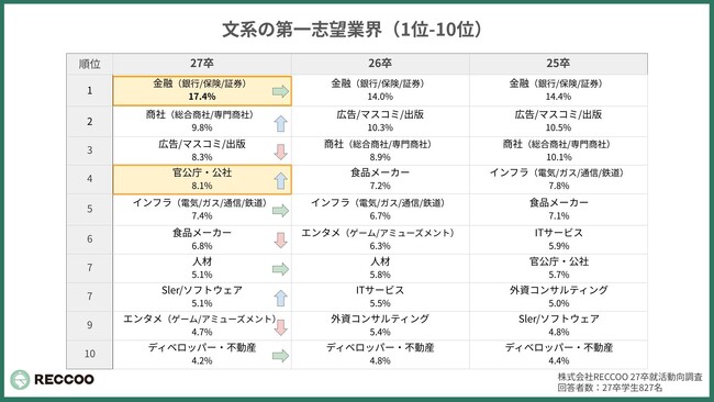 株式会社RECCOO(本社:東京都渋谷区、代表取締役 出谷昌裕)は、旧帝大・早慶・GMARCH等の上位校を中心とした2027年卒業予定学生827名を対象に「志望業界ランキング」を実施しました。本調査は、一般的なランキングでは見えにくい「優秀層」に特化した志向の変化を明らかにし、企業の戦略的な母集団形成を支援することを目的としています。