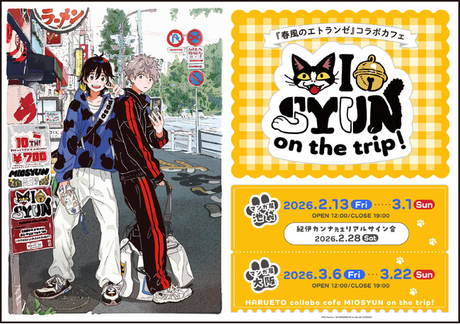 株式会社TORICO(本社:東京都千代田区、代表取締役社長:安藤拓郎)は『春風のエトランゼ』コラボカフェ -みおしゅん on the trip!-を2026年2月13日(金)~3月1日(日)まで同社が運営する東京・池袋の「マンガ展 池袋」にて、2026年3月6日(金)~3月22日(日)の期間、大阪・谷町の「マンガ展 大阪」にて開催いたします。