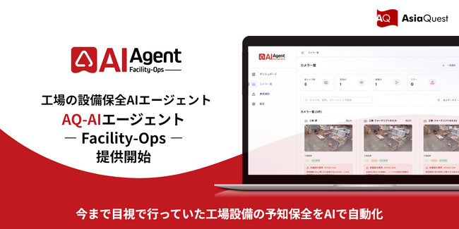 アジアクエスト(東京都文京区)は、自社で開発・提供しているAIエージェント搭載型業務効率化サービス「AQ-AI エージェント」シリーズにおいて、監視カメラ映像の解析AIとAIエージェントが連携し、設備保全における検知から判断まで”を自動化する新サービス「AQ-AIエージェント Facility-Ops」の提供を開始しました。