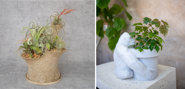 第一弾として販売する、淡路広喜氏(左)、Luminas T / Dynamite T(右)による3Dプリント製の植物鉢
