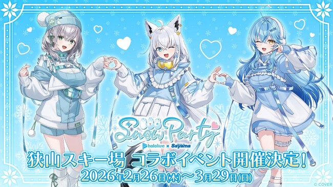 西武レクリエーション株式会社(本社:埼玉県所沢市、社長:依田龍也)が運営する狭山スキー場(埼玉県所沢市)では、カバー株式会社(本社:東京都港区、代表取締役社長:谷郷元昭)が運営する女性 VTuber グループ「ホロライブ」の中でも“雪”を連想させる名前や色を持つ「白上(しらかみ)フブキ」「白銀(しろがね)ノエル」「雪花(ゆきはな)ラミィ」の3名が狭山スキー場を彩るコラボレーションイベント【Sayama hololive Snow Party】を2026年2月26日(木)~3月29日(日)の期間限定で開催します。