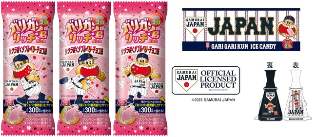 さらに「ガリガリ君リッチサクラ咲くダブルベリーチョコ味」では、抽選で合計300名様に「ガリガリ君×侍ジャパン 観戦盛り上げセット」が当たるキャンペーンを実施いたします。観戦にぴったりのオリジナルフェイスタオルとミニVメガホンがセットで抽選で当たる賞品をご用意しました。