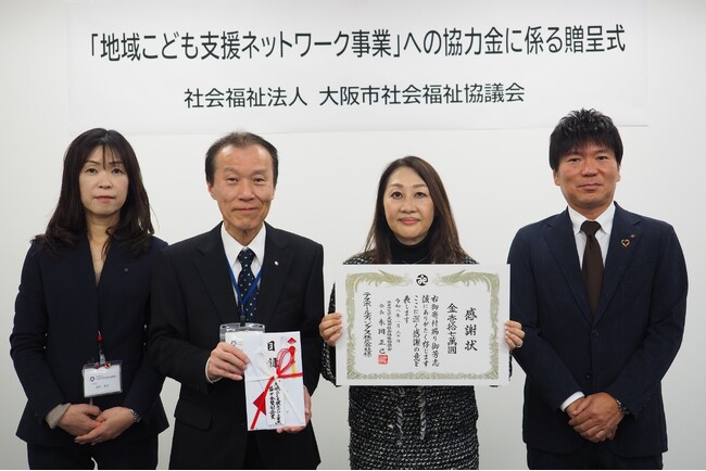テスホールディングス株式会社(本社:大阪市淀川区、代表取締役社長:山本 一樹、以下「当社」)は、社会福祉法人大阪市社会福祉協議会(以下「大阪市社会福祉協議会」)が行う、「社会全体でこどもを支える仕組みづくり-こどもたちの幸せのために-」をミッションに掲げた「地域こども支援ネットワーク事業」へ協力金の寄附を行い、2026年1月30日(金)、大阪市立社会福祉センターで執り行われた贈呈式に参加いたしましたのでお知らせいたします。