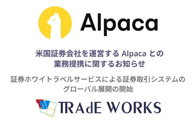 金融システム開発やAI・セキュリティ・ブロックチェーンなどの先端技術を活用したソリューションを提供する株式会社トレードワークス(以下「当社」、本社:東京都港区、代表取締役社長:齋藤正勝)は、AlpacaDB Inc.およびそのグループ企業(以下「Alpaca」、本社:米国カリフォルニア州サンマテオ、CEO 横川 毅)との間で、証券ホワイトラベルサービスの提供を目的とした業務提携契約を締結いたしました。米国株式の取引サービスを中核にアジアおよび中東諸国を皮切りとしたグローバル市場での展開を開始します。