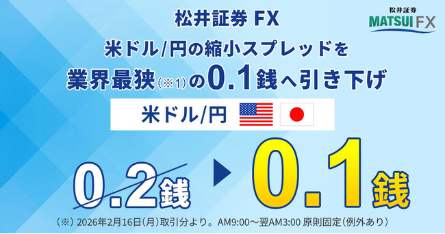 松井証券株式会社(本社:東京都千代田区、代表取締役 社長執行役員:和里田 聰、以下「当社」)は、2026年2月16日(月)取引分より、外国為替証拠金取引(FX)において、米ドル/円の縮小スプレッドを「0.2銭」から業界最狭(※1)の「0.1銭」に引き下げることをお知らせいたします。