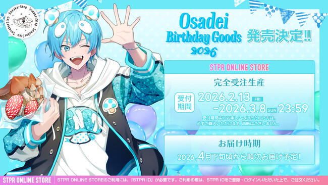 株式会社STPR(本社:東京都渋谷区 代表:柏原真人、以下「STPR」)は、当社所属の2.5次元歌い手アイドルグループ「すにすて - SneakerStep Prod.STPR MUSIC(以下:すにすて)」の「おさでい」の誕生日(2月13日)を記念した「おさでい BIRTHDAY GOODS 2026」の販売を2026年2月13日(金)よりSTPR ONLINE STORE にて開始いたしました。