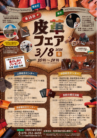 開会式の後、「姫路市消防音楽隊」によるオープニング セレモニーを行います。皮革製品や革素材の展示・販売、革の小物づくりを体験できるレザークラフト教室のほか、版画家の岩田健三郎さんによる似顔絵コーナーやミニコンサートなど盛りだくさんの催し内容になっています。各会場を巡るループバスも運行します。PR TIMESプレスリリース詳細へ