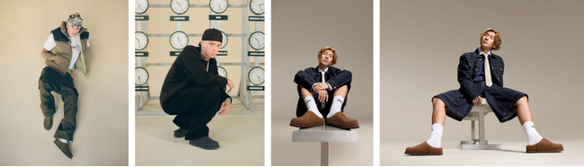 このアイコンのグローバルな進化と再創造が、今季キャンペーンのインスピレーションとなりました。Central Cee は、世界主要都市の時刻を示す時計が並ぶ壁を背景に登場し、UGGのタイムレスなスタイルが世界中で息づいていることを表現。一方、Su Yimingはミニマルな空間でストリートスタイルに身を包み、新作フットウエアの存在感を際立たせています。
