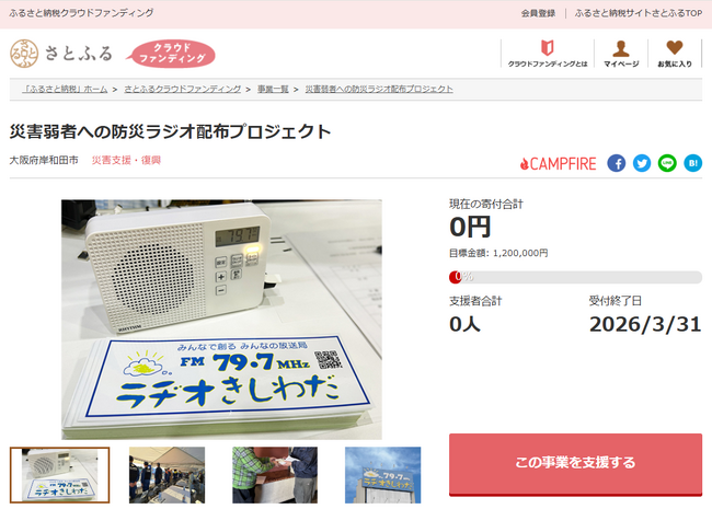 大阪府岸和田市とふるさと納税ポータルサイト「さとふる」を運営する株式会社さとふる(本社:東京都中央区、代表取締役社長 兼 CEO:藤井 宏明)は、「さとふるクラウドファンディング」にて、「災害弱者への防災ラジオ配布プロジェクト」の寄付受け付けを2026年2月13日より開始します。なお、本事業の「さとふるクラウドファンディング」での寄付募集は今回で3回目となります。