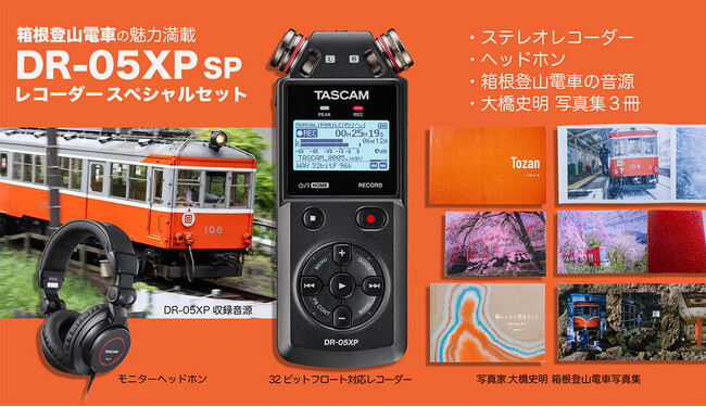32ビットフロート録音対応ステレオレコーダー『DR-05XP』に加え、実際の走行音を収録したmicroSDカードと、大橋史明氏の写真集3冊を同梱した、音と写真で箱根登山電車の魅力を楽しめる内容です。